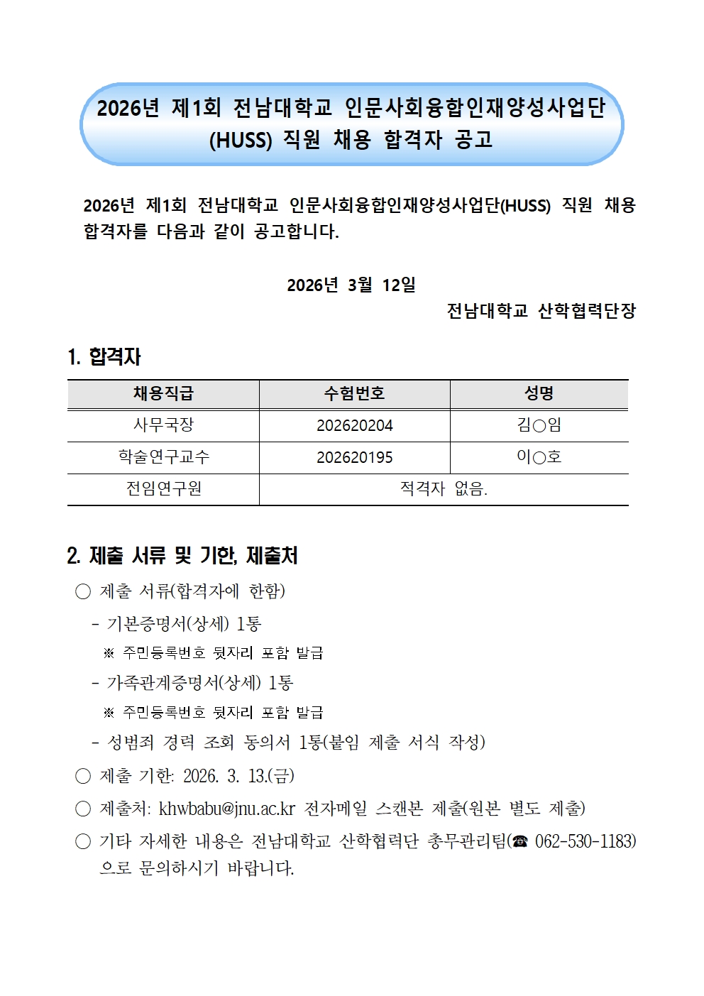 2026년 제1회 전남대학교 인문사회융합인재양성사업단(HUSS) 직원 채용 합격자 공고